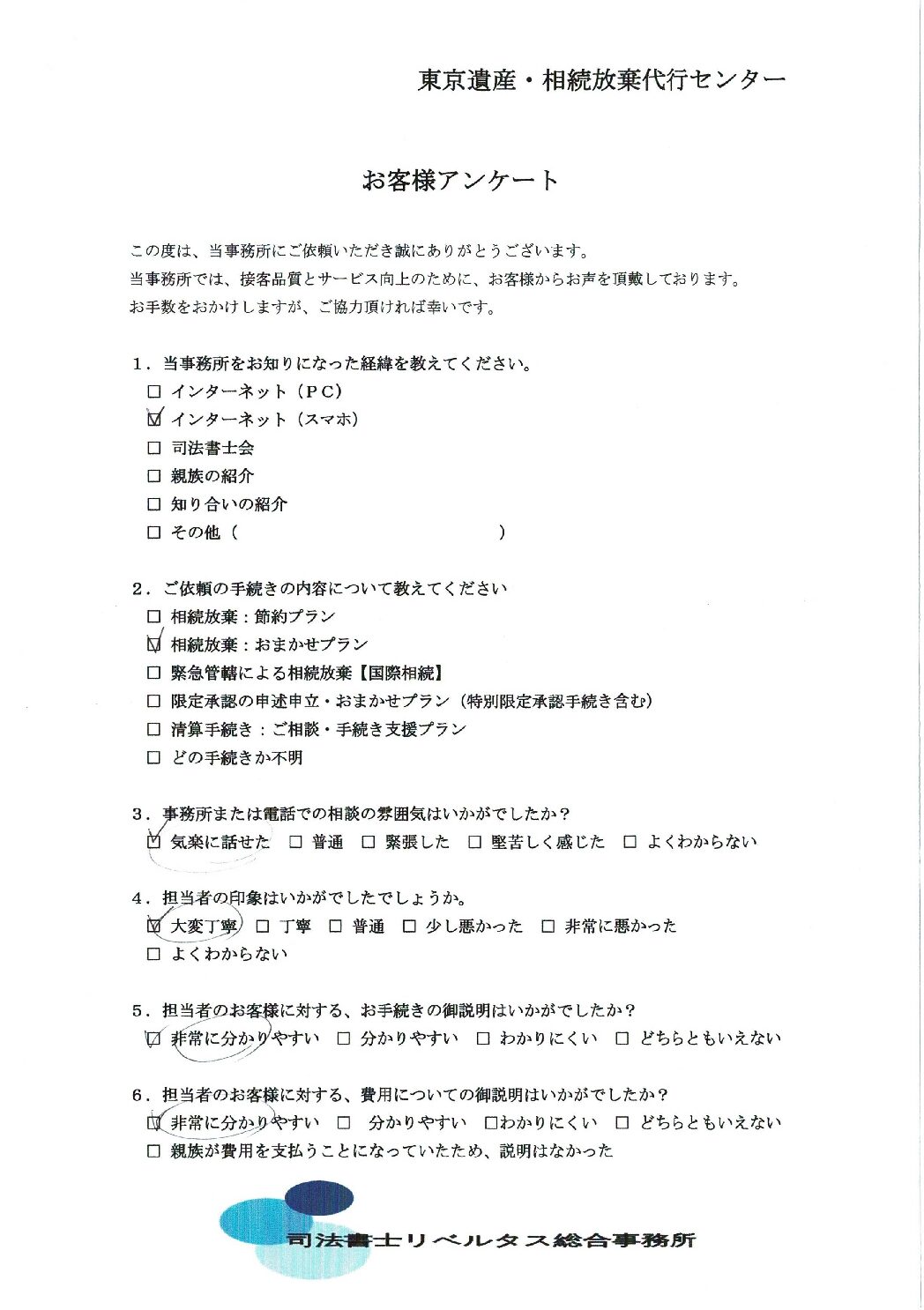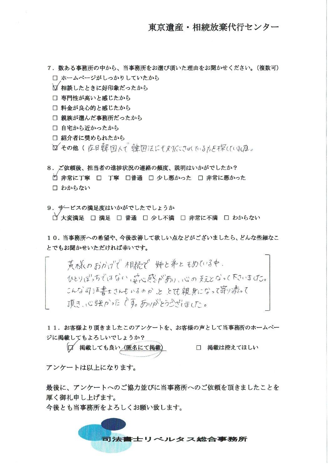 【在日韓国人・相続放棄おまかせプラン】3ヵ月期間経過の案件:(74) 東京都板橋区在住【在日韓国人・相続放棄おまかせプラン】東京遺産・相続放棄代行センターでは、お客様の声を頂き、より一層のサービス向上に努めております。 「当事務所をご利用いただいた方」からお寄せいただいた貴重なお言葉の一部をご紹介させていただきます。