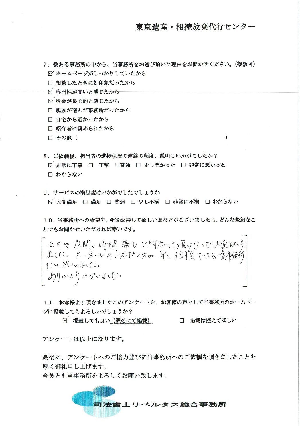 【相続放棄おまかせプラン】3ヵ月期間内の案件:(87) 目黒区在住東京遺産・相続放棄代行センターでは、お客様の声を頂き、より一層のサービス向上に努めております。 「当事務所をご利用いただいた方」からお寄せいただいた貴重なお言葉の一部をご紹介させていただきます。