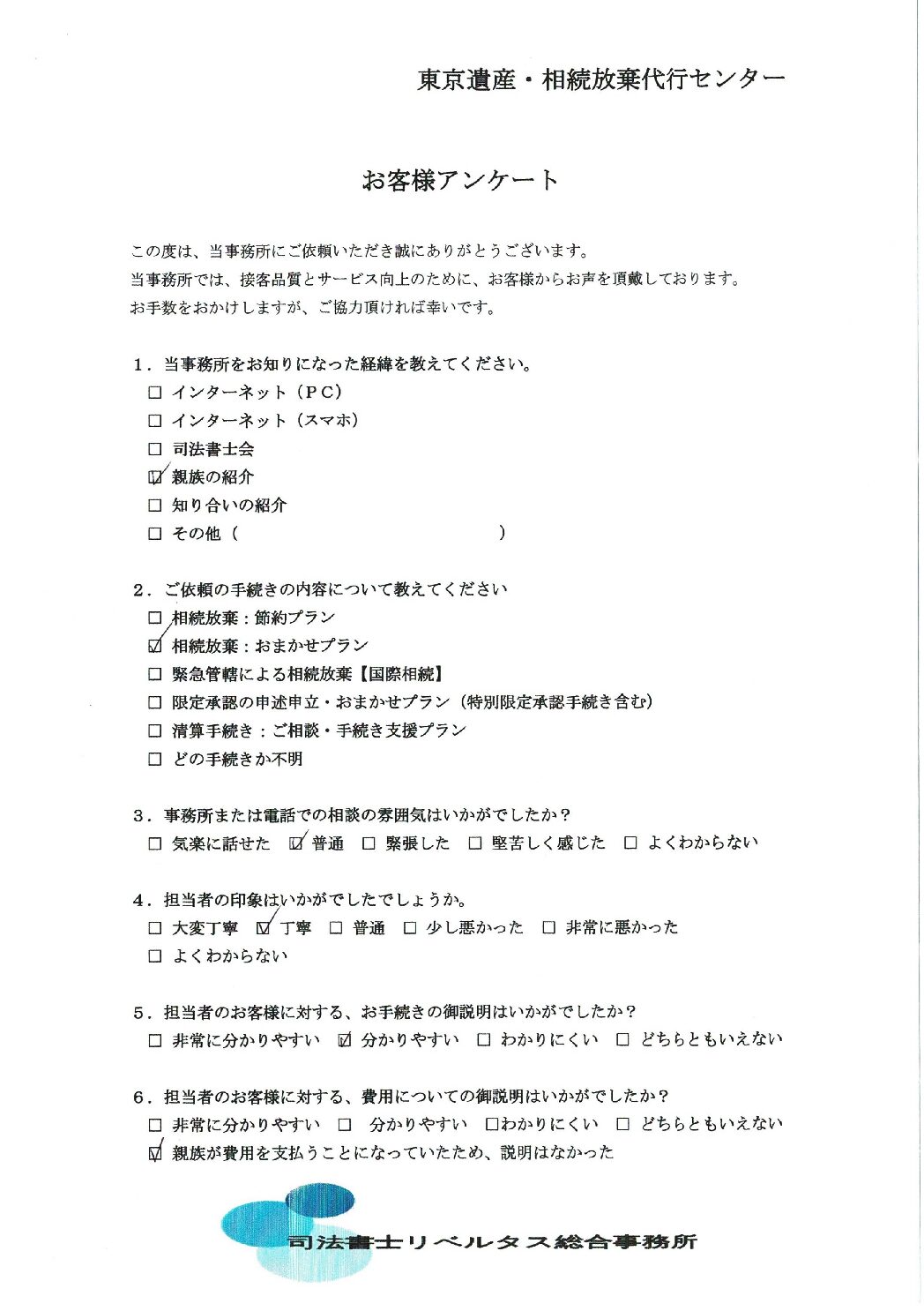 【相続放棄おまかせプラン】3ヵ月期間内の案件:(84) 川崎市在住東京遺産・相続放棄代行センターでは、お客様の声を頂き、より一層のサービス向上に努めております。 「当事務所をご利用いただいた方」からお寄せいただいた貴重なお言葉の一部をご紹介させていただきます。