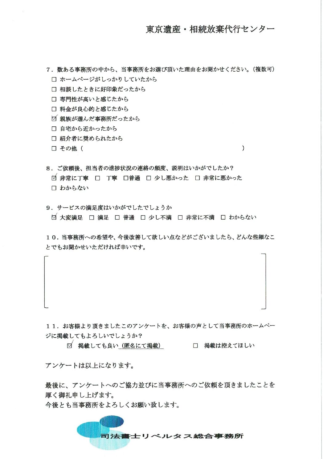 【相続放棄おまかせプラン】3ヵ月期間内の案件:(85) 東京都町田市在住東京遺産・相続放棄代行センターでは、お客様の声を頂き、より一層のサービス向上に努めております。 「当事務所をご利用いただいた方」からお寄せいただいた貴重なお言葉の一部をご紹介させていただきます。