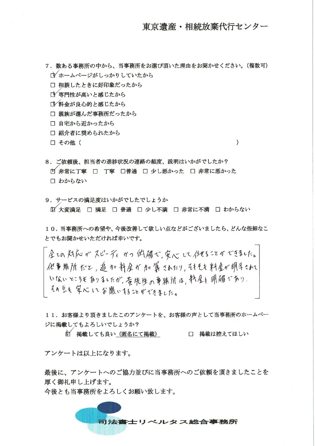 【相続放棄おまかせプラン】3ヵ月期間経過の案件:(79) 静岡県浜松市在住東京遺産・相続放棄代行センターでは、お客様の声を頂き、より一層のサービス向上に努めております。 「当事務所をご利用いただいた方」からお寄せいただいた貴重なお言葉の一部をご紹介させていただきます。